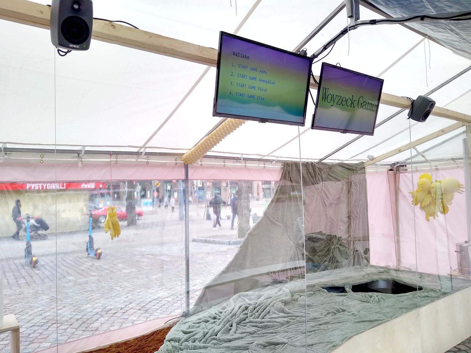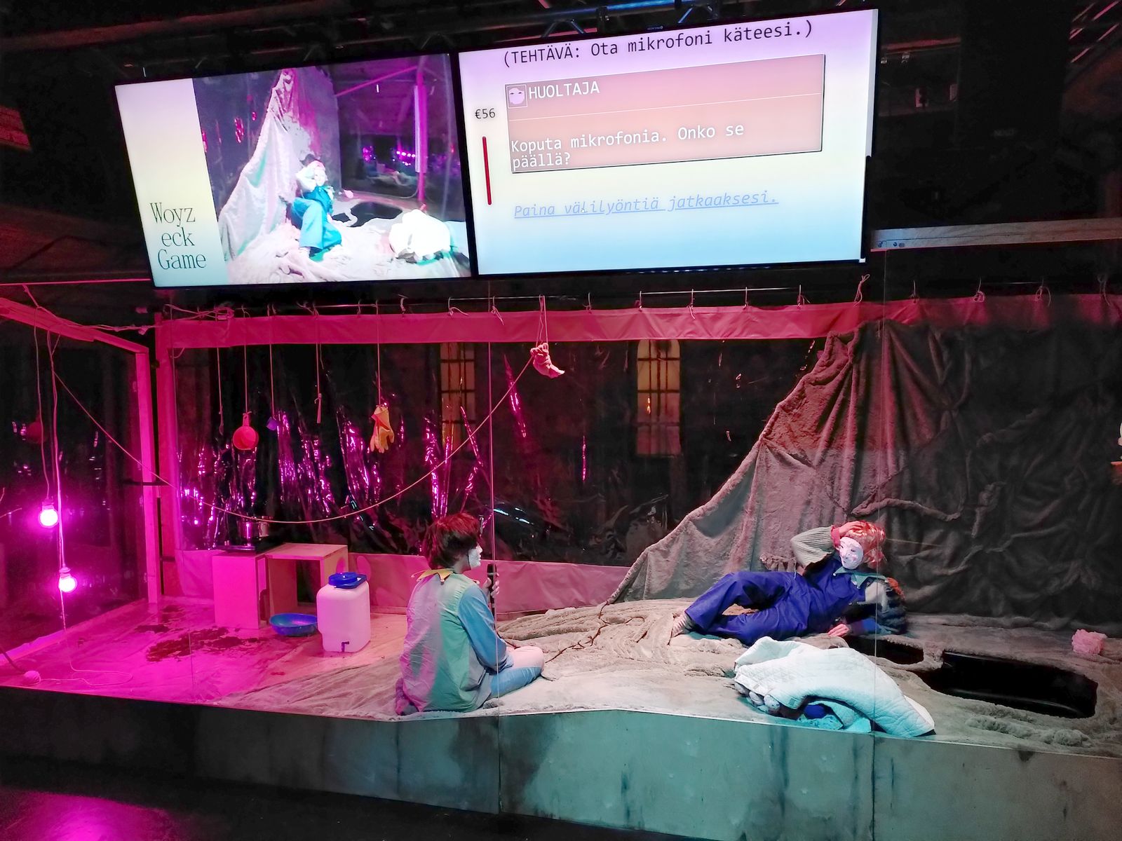 The gamer is seated in a separate room and gets to play with the character of Franz Woyzeck, played by a performer, who lives in a glass terrarium. In the game, the task is to take care, go through everyday life while the audience watch along.